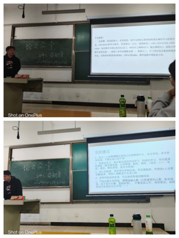 为让同学们对文献查找有进一步的了解,提高同学们的论文书写水平,2023年10月27日,23150241班和23150242班于15208H开展了论文学堂活动。本次活动邀请到我院20级轨道交通信号与控制专业的谷欣翼同学,为同学们进行经验分享。