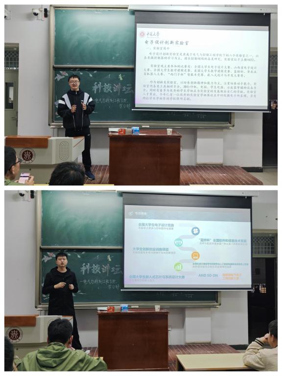 首先介绍的是电气创新实验室的王慧军,他向同学们展示了实验室丰富的研究方向,包括电源电力电子设备、自动控制系统装置、电力系统分析、信号系统处理、嵌入式系统、人工智能机器和物联网等。随后,他详细介绍了实验室专攻的赛事,如全国大学生电子设计竞赛、“蓝桥杯”全国软件和信息技术竞赛、大学生创新创业训练项目、全国轨道交通信号与控制专业人工智能电脑鼠走迷宫线上竞赛以及全国大学生嵌入式芯片与系统设计大赛等,通过分享实验室在这些赛事中取得的优异成绩,让同学们清晰地了解了实验室的前景和潜力。