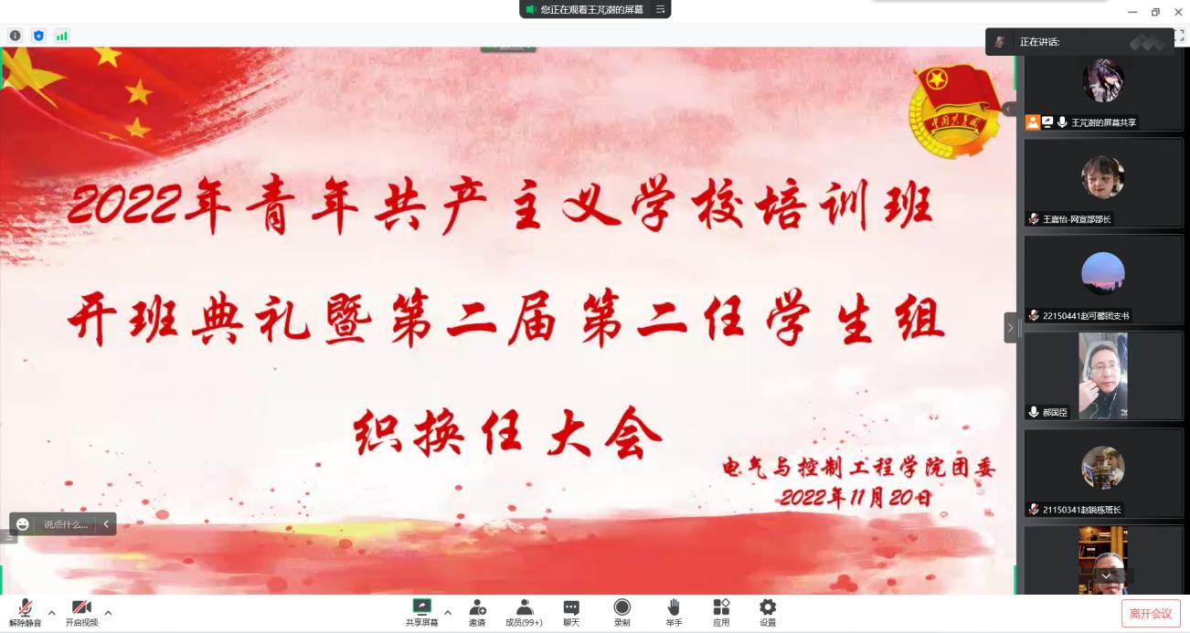 在线上召开了青年共产主义学校培训班暨第二届第二任学生组织换任大会。参加开班典礼的有院党委书记赵正杰、院党委副书记兼副院长杜苇、院团委书记郝国臣以及我院全体学生骨干。本次典礼由院团委副书记王芃澍主持。