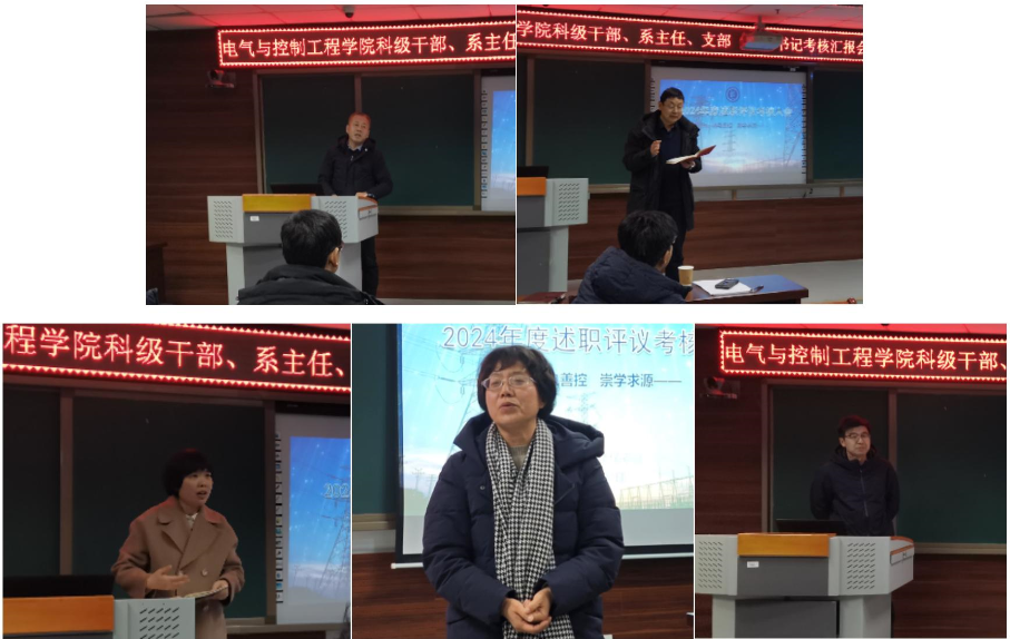 学院5个科室共6位科级干部分别围绕2024年度工作的完成情况、创新工作以及2025年提质增效计划进行了述职。自动化系、电气工程系、智能工程系、交通工程系的系主任依次围绕以本科教学位核心开展的教学研究、师资培训、双创竞赛、校企合作等方面进行汇报。在11位支部书记书面述职的基础上,抽取了教职工第一党支部、电气工程及其自动化专业学生党支部、自动化专业学生党支部、研究生第二党支部及第三党支部共5位党支部书记聚焦支部强基、“五结合”“五个一”特色党建、提质增效计划进行现场述职。现场的气氛向上而热烈。