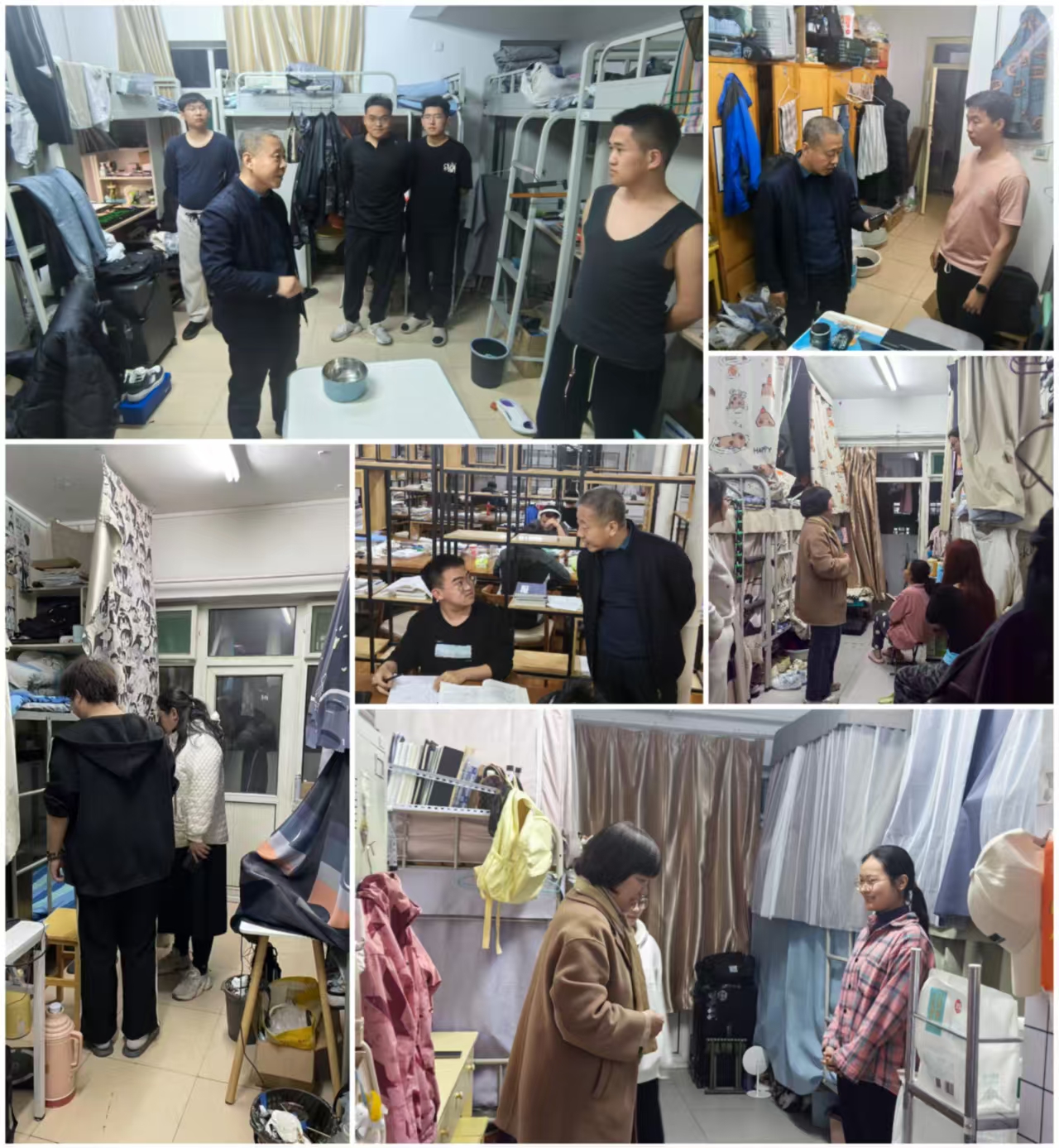 党委书记赵正杰、党委副书记兼副院长杜瑞平带领全体辅导员深入学生宿舍,开展安全检查和走访交流,重点关注宿舍环境、学生学业与就业动态,传递学院的关怀与期望。