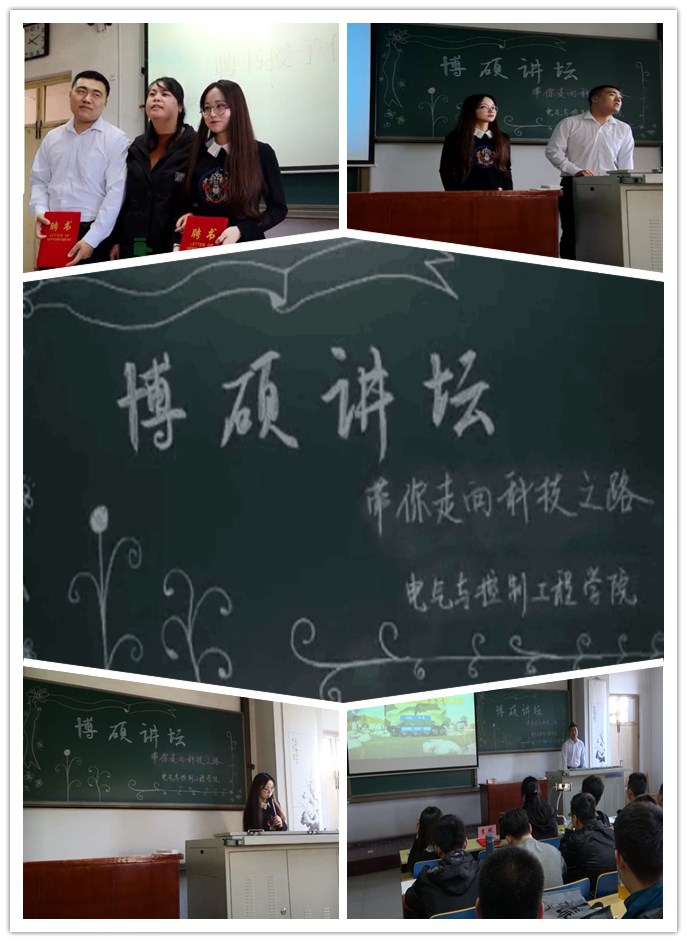 “博硕讲坛第三期主讲人”聘书。讲坛期间,16级硕士研究生张艺学姐给学弟学妹们带来了“控制学科的奥妙”和‘电气工程及其自动化专业的学习指导’的精彩讲座。她分享了学院控制科学与工程方面的研究、无人机动态目标自主跟踪系统研究、空间电源与热管理功能版的项目。同时,结合自己的亲身体验,给大家介绍了科技创新,考研就业的经验。18级硕士研究生李帆学长讲解了目前课题组研究的新课题‘新概念战车’课题的研究构思,研究思路,研究目的及目前的课题的进度,教学弟学妹如何利用学校的资源,如何探寻新的研究方向。随后,与会的学生们就大学的学习目标及方向,科技创新如何起步,考研复试的技巧及研究生攻读方向的选择等问题与学长学姐进行了一一交流。