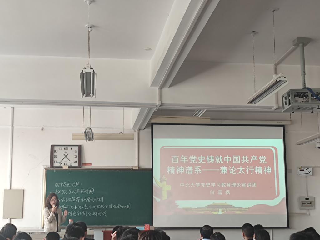 党委在14202H教室举行了学习贯彻习近平总书记“七一”重要讲话精神专题宣讲会,大会邀请到马克思主义学院白雪枫老师作了题为《百年党史铸就中国共产党精神谱系——兼论太行精神》的专题宣讲。会议由学院组织员李艳菲主持,全院200余名师生党员及入党积极分子参加了会议。